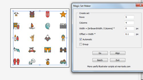 Открываю файл с нужными иконками. Выделяю все объекты и запускаю скрипт. В строках - ROWS и COLUMNS — выставляем значение «1». Все делается за считанные секунды. Очень здорово!